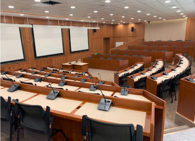 針對(duì)培訓(xùn)室主要用于交流會(huì)議、培訓(xùn)等使用形式,鐵三角在話筒系統(tǒng)設(shè)計(jì)上,將培訓(xùn)室房間面積500平,劃分為3個(gè)區(qū)域,每個(gè)區(qū)域共放有32套有線單元。其中兩個(gè)50INT同聲傳譯單元在單獨(dú)房間做翻譯用,培訓(xùn)室內(nèi)共98套有線單元,針對(duì)每個(gè)區(qū)域的32套有線話筒用兩條專用網(wǎng)線形成一個(gè)環(huán)路各接一臺(tái)會(huì)議主機(jī)。