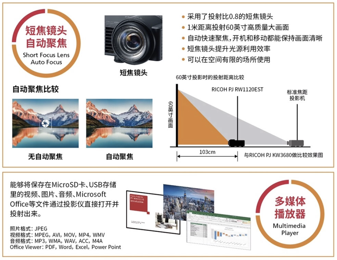 第二,產(chǎn)品創(chuàng)造性的將短焦應(yīng)用于LED超便攜投影設(shè)備,產(chǎn)品集成程度已經(jīng)極高。但是,理光依然能夠在機(jī)身內(nèi)部集成“自動對焦”功能,實(shí)現(xiàn)開機(jī)迅速自動對焦,畫面瞬間清晰,不需要額外調(diào)試,帶來應(yīng)用速度的進(jìn)一步提升。