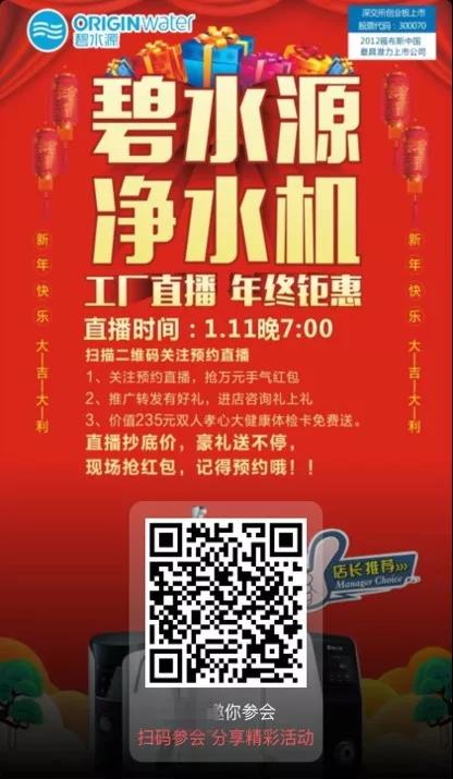 這一次,碧水源與微吼合作,將直播間搬到產(chǎn)品體驗(yàn)區(qū)。客戶(hù)進(jìn)入直播間,開(kāi)屏海報(bào)映入眼簾,碧水源公眾號(hào)二維碼隨即彈出,歡迎模式不僅充滿(mǎn)人性化還進(jìn)一步擴(kuò)充自身私域流量池。