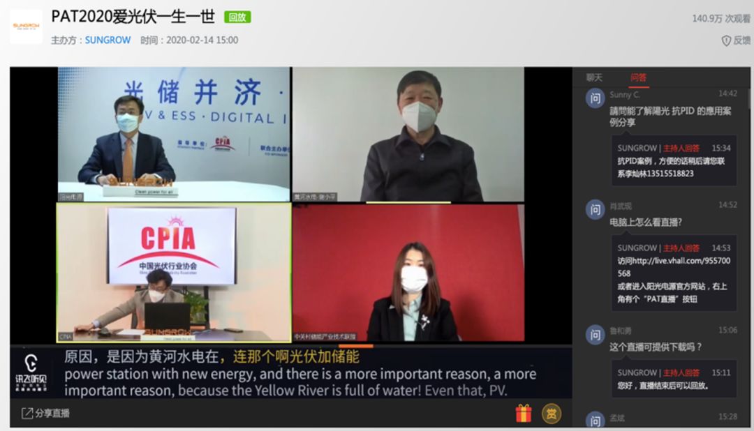 本屆PAT2020,陽(yáng)光電源與微吼合作,開(kāi)創(chuàng)了中國(guó)光伏技術(shù)研討?hù)咝缕钒l(fā)布“純線(xiàn)上會(huì)議”形式,兩小時(shí)在線(xiàn)觀(guān)看人次超過(guò)140萬(wàn),評(píng)論互動(dòng)數(shù)萬(wàn)條。由此,陽(yáng)光電源的這次直播也被網(wǎng)友稱(chēng)之為光伏界“李佳琦”的誕生。