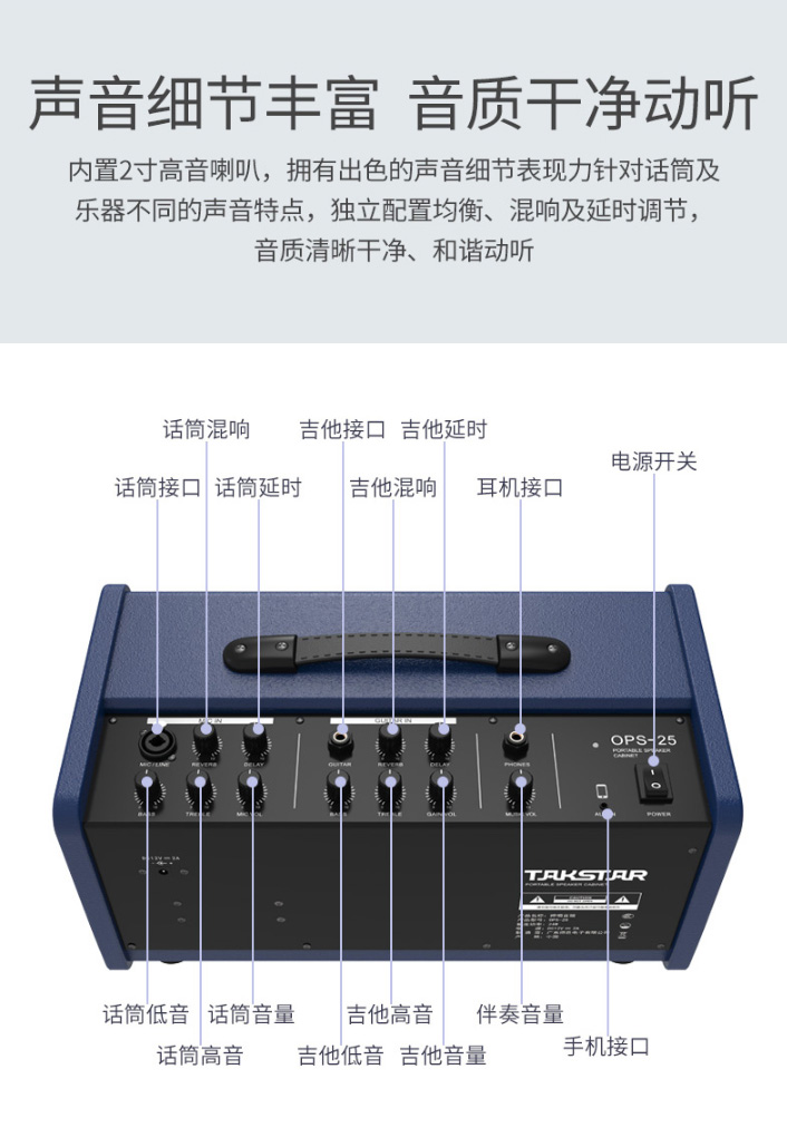 OPS-25可輸出24W大功率音量,聲音清晰有力、穿透力強(qiáng)、音質(zhì)美妙,是由內(nèi)置的兩個(gè)6.5寸高性能紙盆揚(yáng)聲器提供強(qiáng)勁的全頻聲,內(nèi)置的2寸高音喇叭豐盈聲音細(xì)節(jié),音箱表現(xiàn)聲音豐富有感染力。