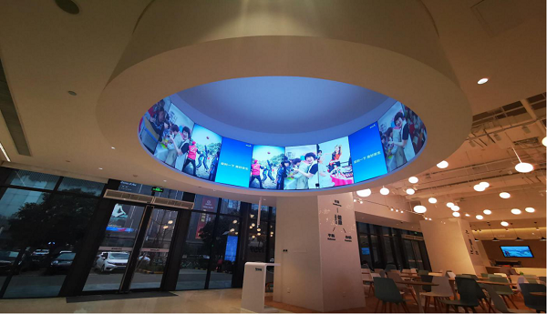 ①環(huán)形微笑屏——由16臺(tái)46寸液晶屏拼接而成的環(huán)形屏,吊裝在前廳頂部, 對(duì)安裝的穩(wěn)定性、安全性要求很高。在軟件功能上可以實(shí)現(xiàn)參觀者人臉捕捉,然后 上傳至環(huán)形屏進(jìn)行展示,今后將記錄每一位參觀顧客的微笑,增加體驗(yàn)館的人氣;