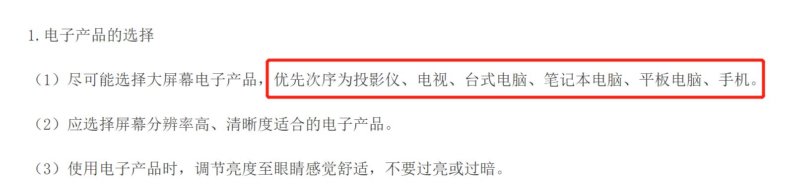 日前,國(guó)家衛(wèi)生健康委發(fā)布了《兒童青少年新冠肺炎疫情期間近視預(yù)防指引》,對(duì)電子產(chǎn)品的選擇優(yōu)先次序做出了規(guī)范,《指引》指出:“盡可能選擇大屏幕電子產(chǎn)品,優(yōu)先次序?yàn)橥队皟x、電視、臺(tái)式電腦、筆記本電腦、平板電腦、手機(jī)!