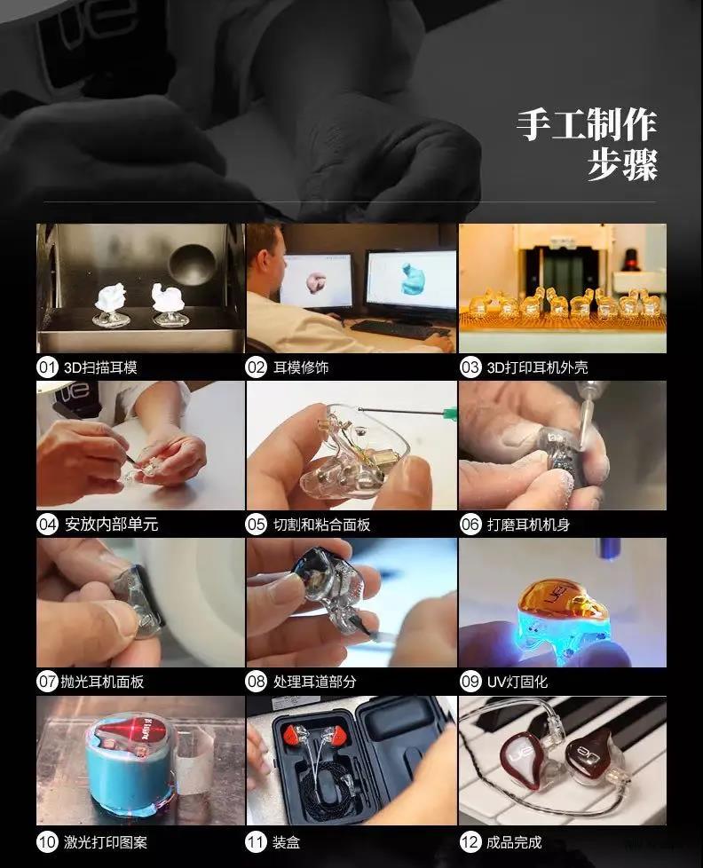 每一副UE耳機都是由技術人員純手工制作,而且每一副UE定制耳機都是根據(jù)使用者的耳道輪廓而做出完美貼合耳朵的耳機。