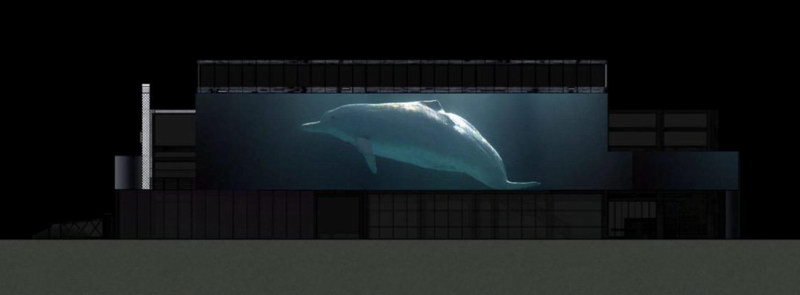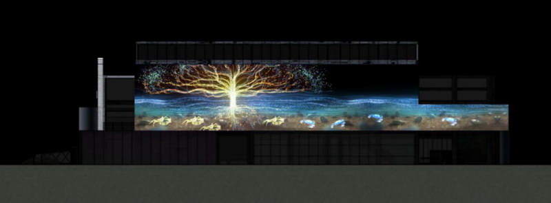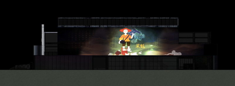 展示方式以立體投影為主,依托蠔鄉(xiāng)湖公園文創(chuàng)展館南側(cè)墻體,在墻體上以三維動(dòng)畫(huà)+二維動(dòng)畫(huà)+實(shí)景特效表現(xiàn)。