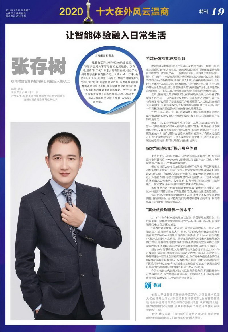 2020溫州經(jīng)濟(jì)年度人物評選活動于近日落下帷幕,聰普智能創(chuàng)始人張存樹先生獲「2020十大在外風(fēng)云溫商」榮譽(yù)稱號。