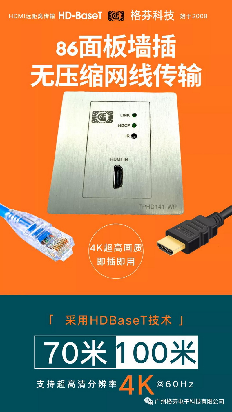 通過Cat6雙絞線,可實現(xiàn)長達(dá)70~100米的信號傳輸,遠(yuǎn)遠(yuǎn)優(yōu)于目前的HDMI、VGA、Display-Port標(biāo)準(zhǔn),是較遠(yuǎn)距離傳輸上的不二選擇。常見如投影機(jī)、電視、混合矩陣、高清播放器等。支持POC/POE功能。, 設(shè)有HDMI輸入接口,將接收的HDMI信號轉(zhuǎn)換為HDBaseT格式,并通過RJ45接口輸出。同時GEFFEN格芬科技GF-TPHD桌插/插墻/地插系列還支持紅外輸入和RS232輸入,可同時將IR信號以及RS232信號與HDBaseT信號一同輸出給接收端。