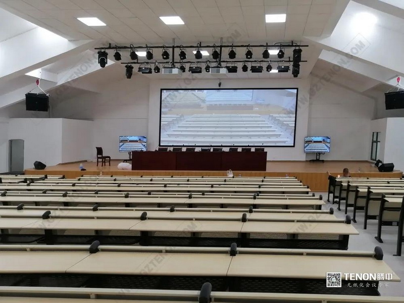 因為要兼顧舞臺表演方式,因此,在采用傳統(tǒng)手拉手會議系統(tǒng)的方式下,還搭配了無線會議系統(tǒng),方便各種用途的需要。