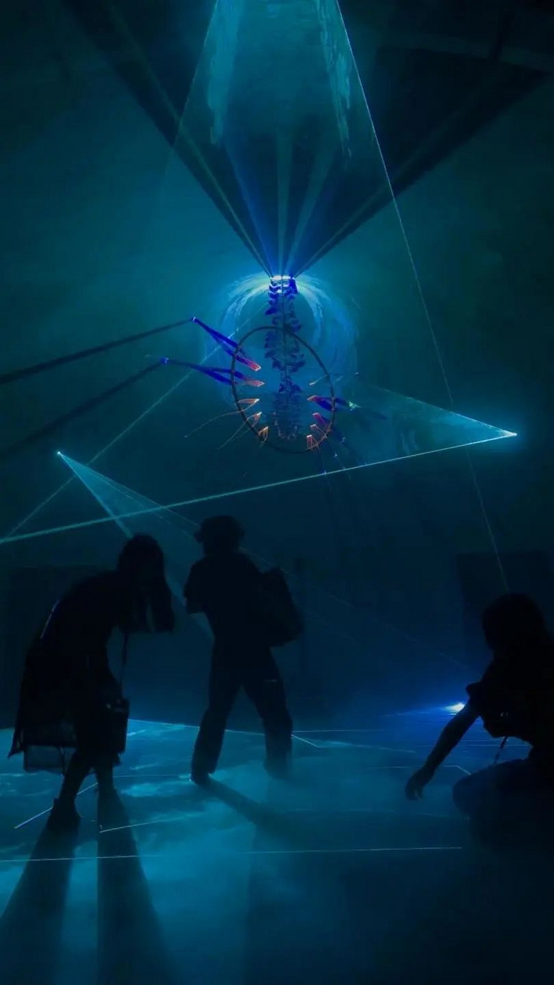 機(jī)械花在觀眾靠近時(shí)便收起綻放的花瓣,被激光掃描而出的虛空間包裹在內(nèi),當(dāng)觀眾離開時(shí)悄然綻放從人面對(duì)他人時(shí)自我情緒隱藏的現(xiàn)象出發(fā),內(nèi)在世界無法完全獨(dú)立于外部世界存在,內(nèi)部世界與外部世界時(shí)刻處在一種動(dòng)態(tài)的“交互與平衡”之中。