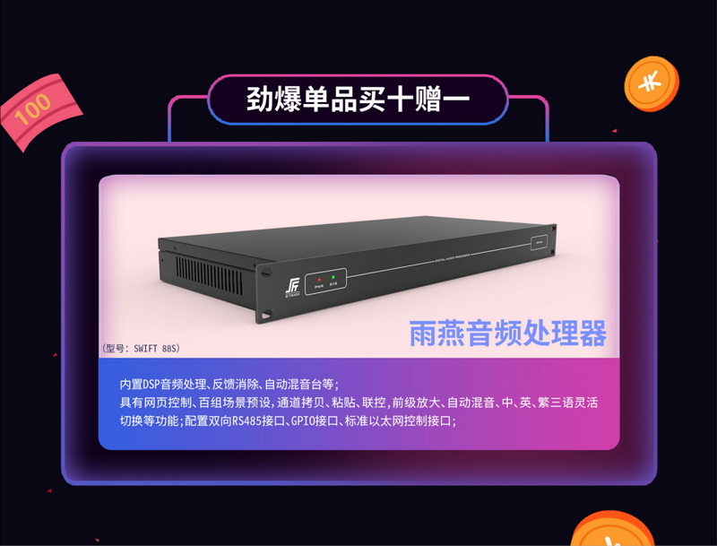 勁爆單品SWIFT 88S數(shù)字音頻處理器采用先進的DSP處理技術,擁有全新的自動混音、反饋消除等算法,針對性的解決應用場景中的各種實際問題。由于大部分的控制都通過軟件操作,所以外觀得以更加簡潔明快。操作人員只需輕輕點擊下鼠標,不用再像以往一樣,在現(xiàn)場調整復雜的大型調音臺來完成功能轉換,大大簡化了操作難度。