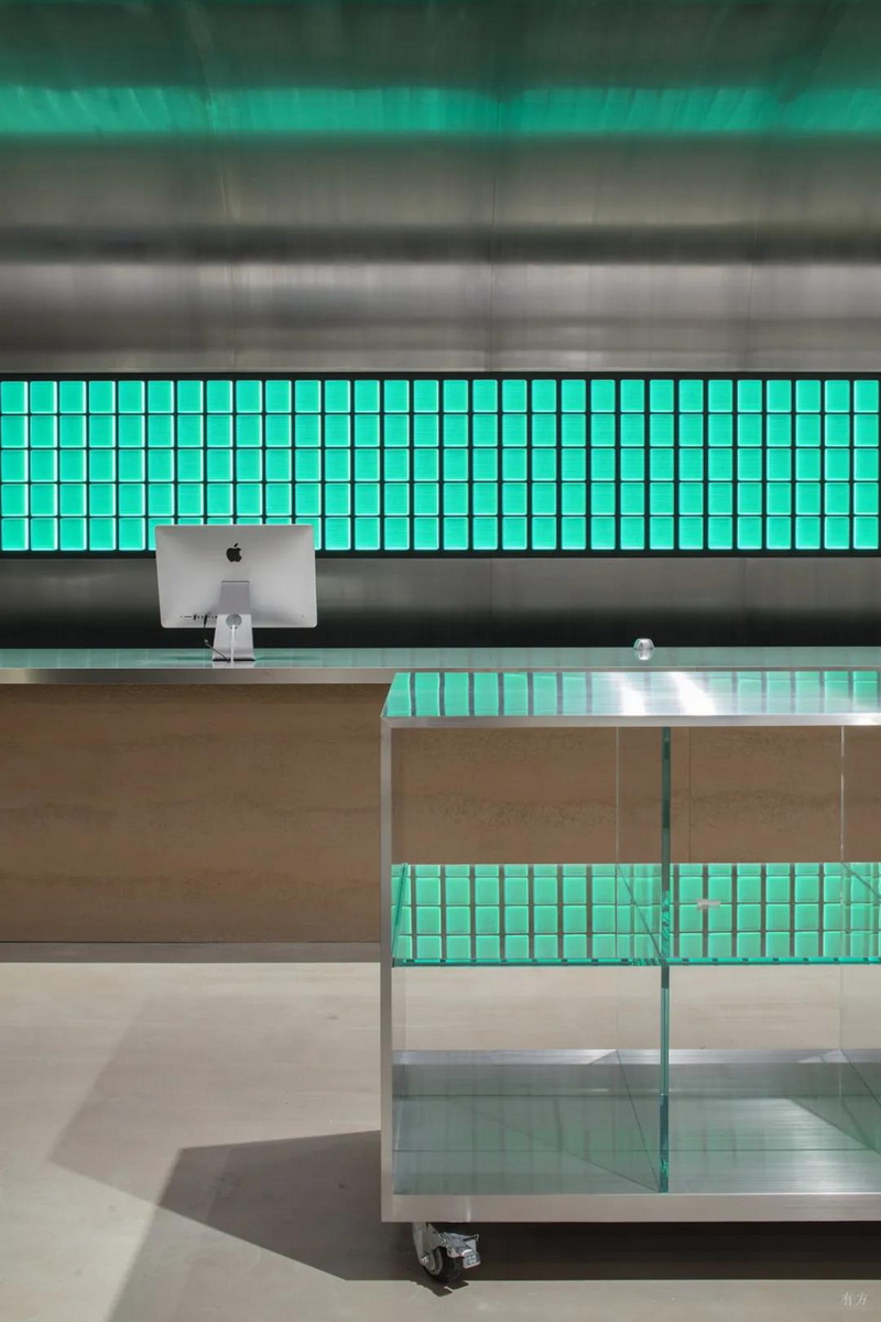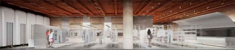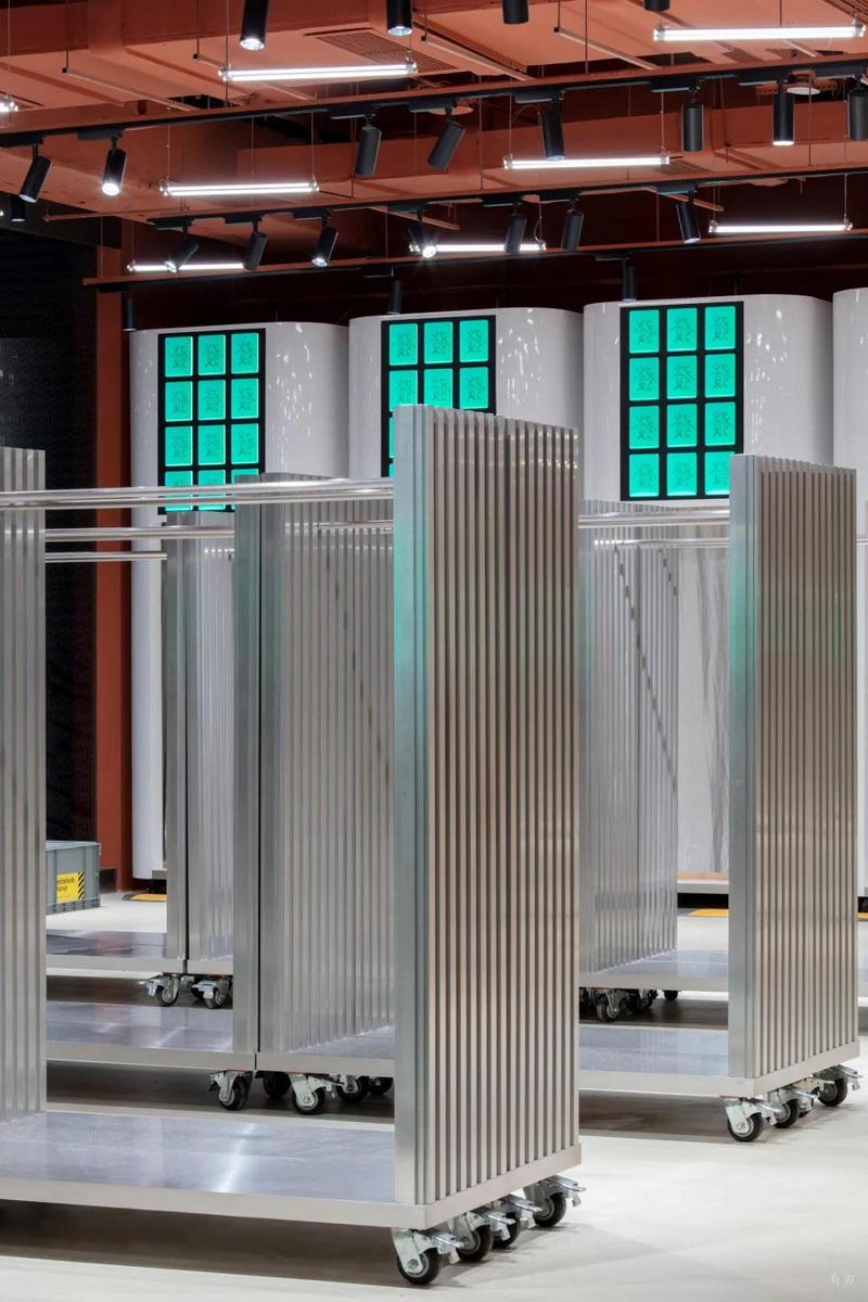 半封閉表皮將屏幕包裹在內(nèi),承接起上下場景的切換作用。圓環(huán)形的紅土色造型,實際上又內(nèi)藏了整套防火卷簾設備。更衣室是五組白色膠囊容器裝置,上部屏幕和其他裝置畫面同步聯(lián)動。店內(nèi)的金屬道具靈活多變,可以隨意組合。收銀臺也是一組裝置,背景上的一條長屏可以輸出不同主題的信息和氛圍,成為“另一個時空”的窗口。
