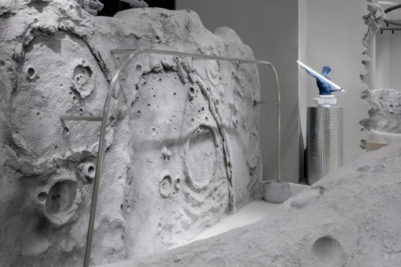 新零售空間當下所截取的“時髦表皮”,往往被自身不斷更迭的產(chǎn)品所傳達出的藝術信息給顛覆。所以,我們選取月球表面和火星影像作為整個空間的基底皮膚,以此抵抗這一悖論所形成的局面。