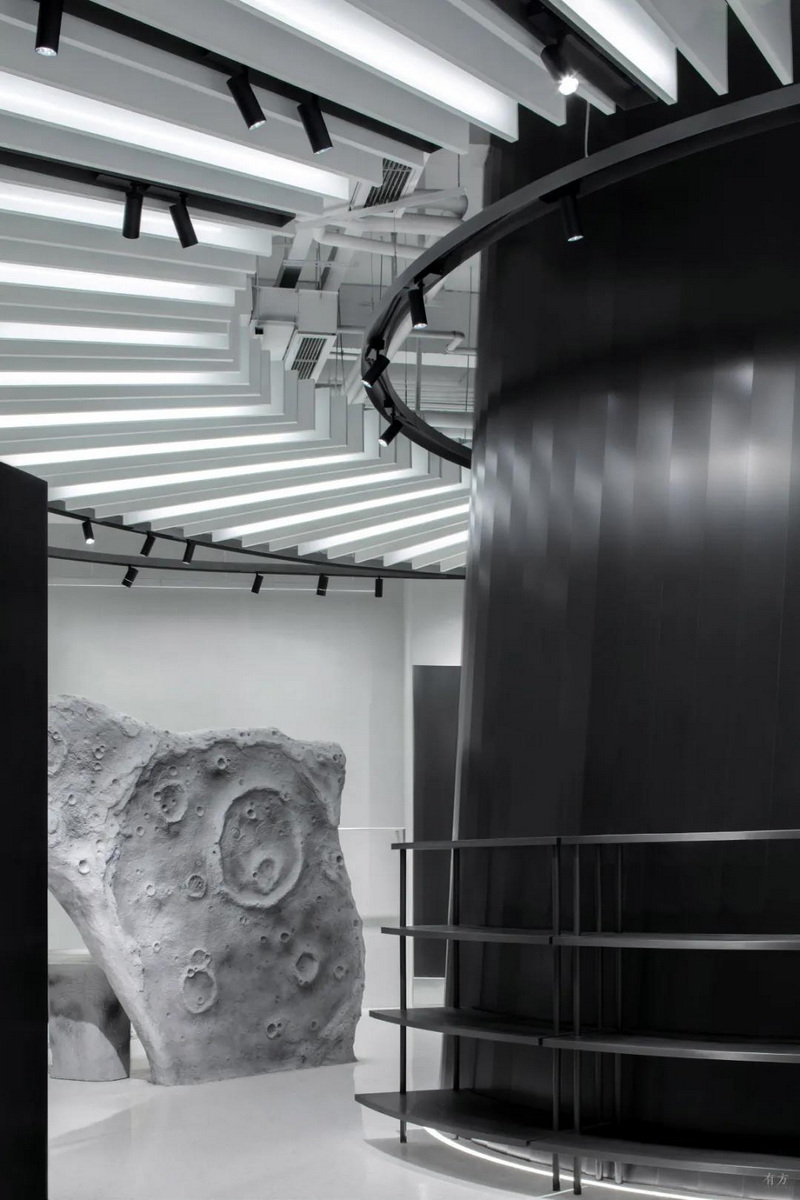 零售空間首層的敘事以“月球表面”拉開序幕,我們將“星軌”的特性融進室內(nèi)空間,隨著軌道的旋轉(zhuǎn),仿佛形成一個持續(xù)更新進化的場所,而非被鎖定在某種預定的形式之中。