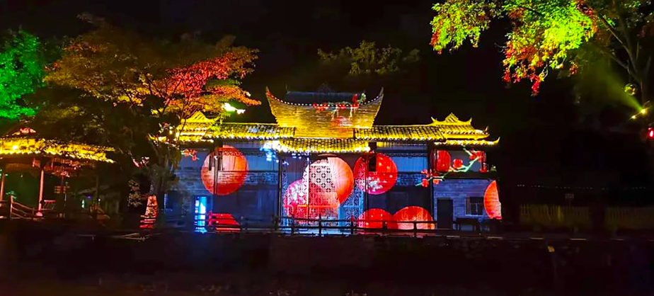 兩臺(tái)科視 DWU2022-HS 激光投影機(jī)在一座古老的土家族民居上展示色彩繽紛的影像