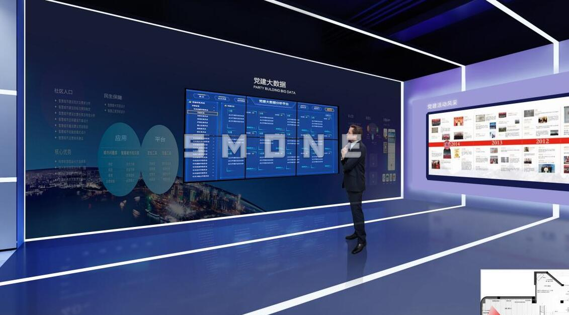 進入工業(yè)富聯(lián)黨群服務中心展廳,映入眼簾的是一道以黨建100周年標志為背景的LED大屏,屏幕可用來迎賓,也可以針對不同受眾 播放不同的畫面渲染不同的展廳氛圍,奠定展廳的整體基調(diào);繼續(xù)向前參觀,LED屏幕向左右緩緩打開 地面上投影的代表黨的發(fā)展歷程中重要歷史事件年份如同跑馬燈一節(jié)節(jié)的亮起,為參觀帶來強烈的儀式感