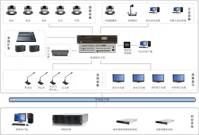 本次視通科技為滿足北京理工大學(xué)模擬法庭而建設(shè),本項(xiàng)目共建設(shè)1個(gè)模擬法庭,使用1臺視通科技(AVSYS)高清庭審主機(jī),利用網(wǎng)絡(luò)技術(shù)、先進(jìn)的多媒體技術(shù)以及集中控制技術(shù),實(shí)現(xiàn)審理過程中的實(shí)況采集、證據(jù)公開展示、筆錄校對、審理直播,并對審理庭內(nèi)部聲、光、電等各種設(shè)備進(jìn)行集中自動(dòng)化控制,提供審理信息化的強(qiáng)大應(yīng)用。