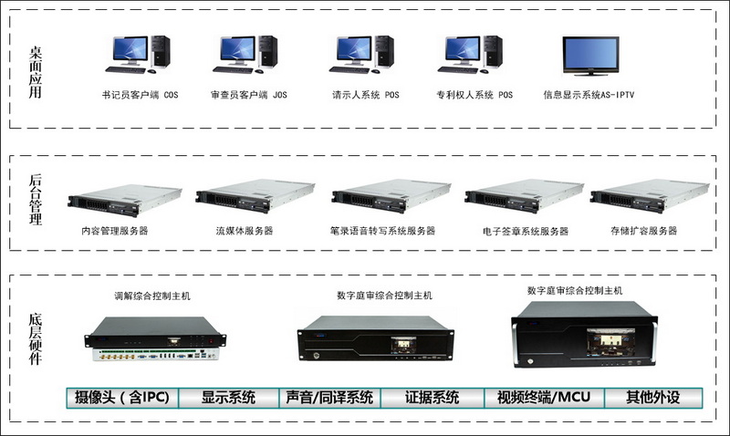 數(shù)字審理綜合控制主機(jī)、調(diào)解綜合控制主機(jī)、應(yīng)用電腦、圖像采集、證據(jù)采集、顯示輸出、旁聽及信息展示、音頻采集、音響擴(kuò)音、可視化集中控制終端、同聲傳譯、存儲(chǔ)擴(kuò)容。