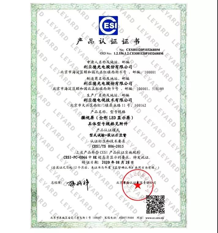 利亞德于2020年8月,成為國內(nèi)首家獲得權威8K認證的Micro LED超高清顯示屏企業(yè)