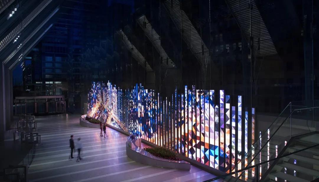 這個(gè)由長短大小不一的異形屏拼接而成的巨幕長38.7米,由89個(gè)獨(dú)立的垂直懸掛LED顯示屏組成,屏幕高度和寬度各異,屏幕播放著天馬行空的絢麗影像,帶來驚艷的動(dòng)感數(shù)字視覺體驗(yàn)。