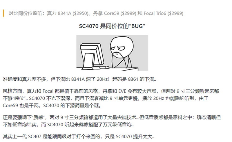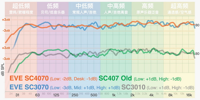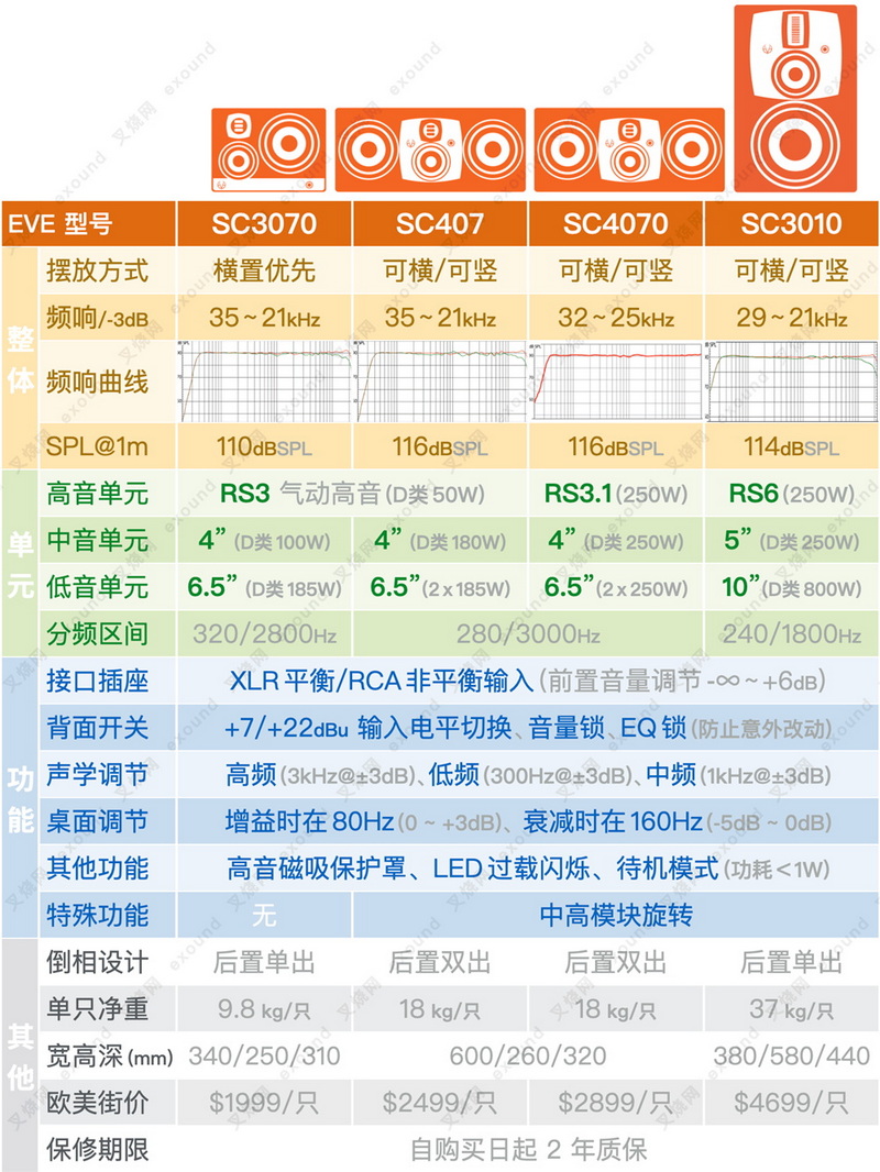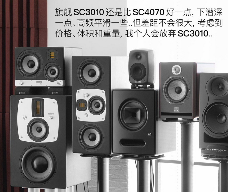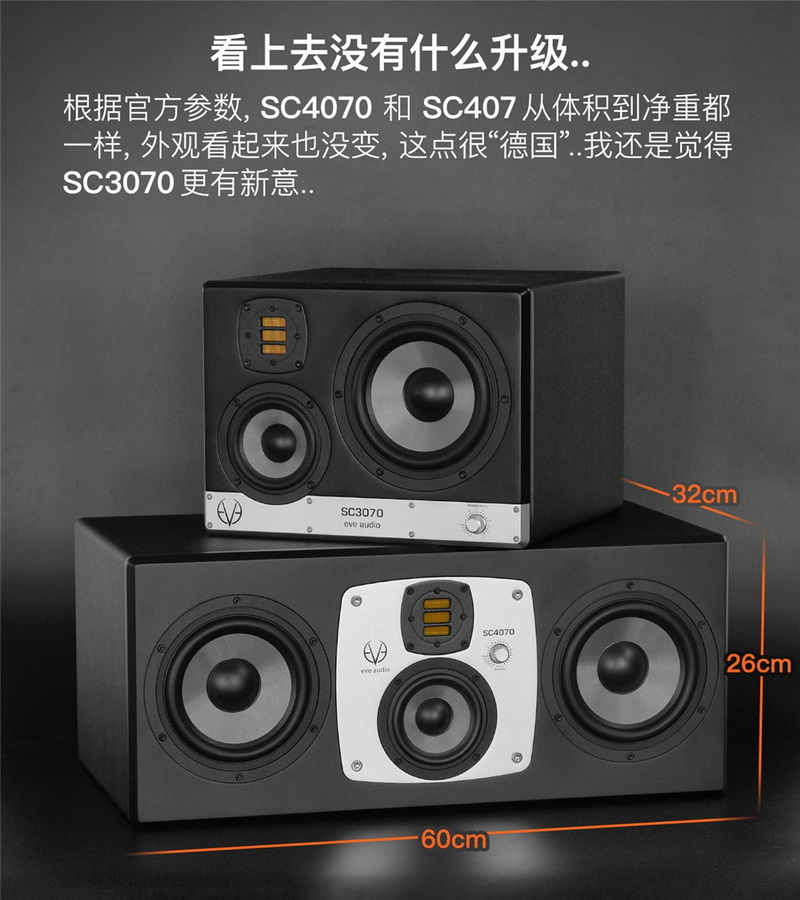 在錄音行業(yè),Main Monitor“主監(jiān)聽”通常要比 Mid-Field “中場監(jiān)聽” 有更大的聲壓和下潛,其實(shí)去年 EVE 推出的 SC3070 (評測) 就分類到主監(jiān)聽了,貌似 EVE 的“四字哥哥”都定位主監(jiān)聽。