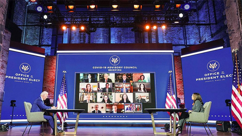 遵循于這種新舊結(jié)合的理念,在最終的舞臺呈現(xiàn)上可以看到,整個演播室被包圍在傳統(tǒng)建筑的紅色磚墻之中。演播室內(nèi)部,舞臺上安裝了三面大型小間距LED高清屏幕,以兩側(cè)小,中間大的形式分布,傳統(tǒng)與現(xiàn)代的結(jié)合兼顧了歷史美感與實用性。大選期間,拜登團(tuán)隊就在這個演播室進(jìn)行了一場又一場的新聞發(fā)布、政治會議、與選民互動……并最終取得了勝利。