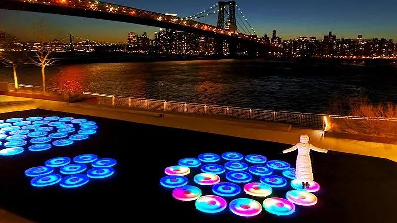由美國新媒體藝術(shù)家Jen Lewin創(chuàng)作的Reflect是一種沉浸式的、多感官的體驗,其靈感來自于自然界中發(fā)現(xiàn)的有機系統(tǒng)所創(chuàng)造的動態(tài)模式。這座雕塑占地2400平方英尺,由三個同心圓組成,每個同心圓由互動平臺組成,響應(yīng)游客的腳步,觸發(fā)光的飛濺,創(chuàng)造出不斷變化的構(gòu)圖。這個裝置將鼓勵紐約人停下來思考和發(fā)現(xiàn),并在城市進入一個充滿希望和復(fù)興的新時代時激發(fā)聯(lián)系。