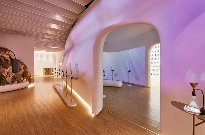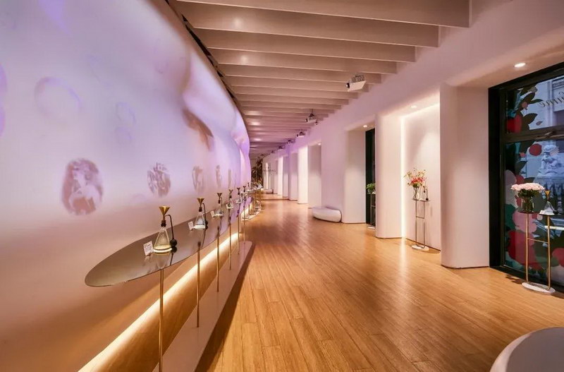 主展廳:是一面20米長,水珠形態(tài)的“動態(tài)歷史墻“。變幻的色彩在曲面墻上流動,營造出香水的主題氛圍,同時展示香水的歷史,材料等與展品相關(guān)的信息說明。