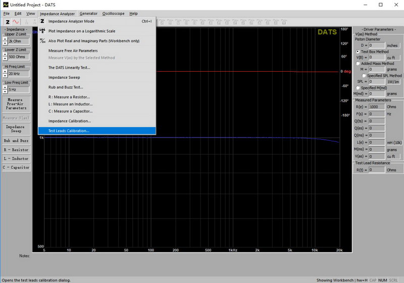 從DATS “Impedance Analyzer”菜單中選擇“Test Leads Calibration…”。將測試引線短路,然后單擊 “OK”,以針對測試引線電阻校準(zhǔn)軟件。測試引線電阻應(yīng)小于1歐姆,如下圖所示的DATS屏幕右下角所示。如果測試引線無法校準(zhǔn),在 “Impedance Analyzer”菜單下選擇 “Impedance Calibration…”,單擊 “Restore Default Calibration”,并重復(fù)測試引線的校準(zhǔn)過程。