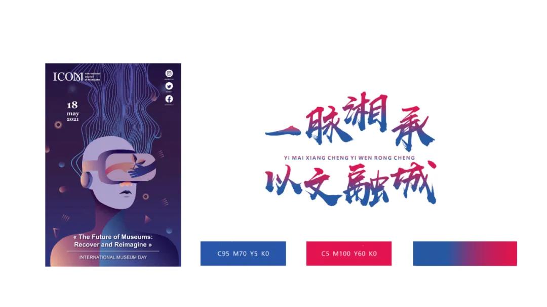 顏色上,經(jīng)典藍(lán)代表智慧,明亮紅代表熱情,漸變延伸出的聯(lián)盟紫與第45屆國(guó)際博物館日的海報(bào)色調(diào)有著異曲同工之妙。標(biāo)示宛如開(kāi)啟長(zhǎng)株潭文化大門(mén)的鑰匙,更意味著在探求知識(shí)領(lǐng)域的過(guò)程中學(xué)習(xí)、研究永無(wú)止境,生生不息的哲學(xué)意蘊(yùn)。