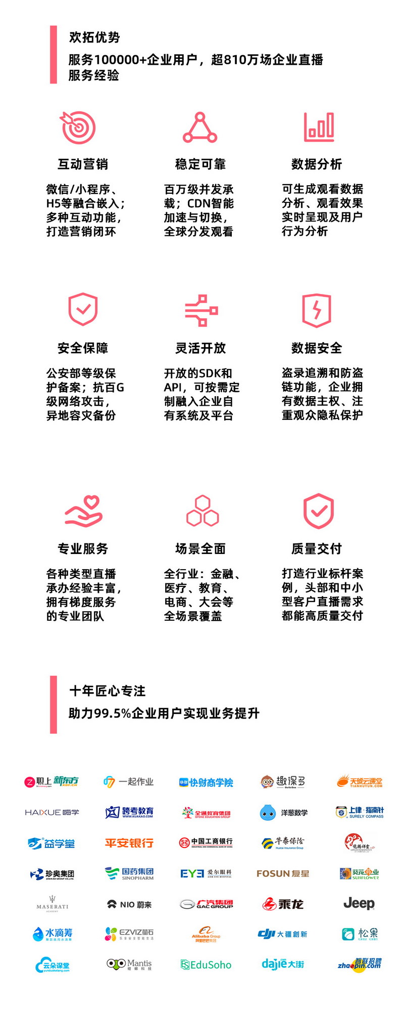 教育、金融、汽車行業(yè)等信息化程度較高、規(guī)模較大的企業(yè)在已經(jīng)有一定直播經(jīng)驗的基礎(chǔ)上,隨著開播頻次的提高,不再滿足直播的淺層次應(yīng)用,急需尋求符合其自身業(yè)務(wù)特點的行業(yè)直播解決方案。