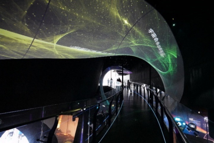“征程”展區(qū)中的“未解之謎”展項令人過目難忘,長度約50米的光影飄帶包裹環(huán)繞觀眾出口走廊,并緩緩運動。出色的影像效果由10臺科視DWU630-GS激光投影機呈現。未解之謎光影飄帶的迷人效果是通過科視Christie 潘多拉魔盒 V8 軟件實現,其強大精準的3D曲面矯正工具、三維True 3D渲染引擎和開放的多協(xié)議交互平臺“窗口部件設計器”,最終呈現了宇宙飄帶的瑰麗視效。
