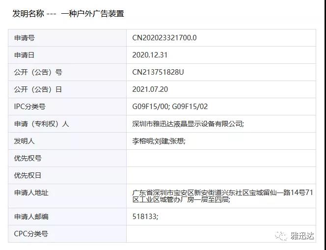 此專利的獲批,是雅迅達在戶外廣告機行業(yè)深耕發(fā)展的結(jié)果,也是雅迅達對戶外廣告機產(chǎn)業(yè)未來市場的布局。目前,雅迅達的戶外廣告機產(chǎn)品已經(jīng)成為公司的主要產(chǎn)品支柱,立式戶外廣告機,壁掛戶外廣告機,超薄戶外廣告機,帶頂棚的戶外廣告機等戶外產(chǎn)品型號齊全,均可規(guī)模生產(chǎn),并支持定制化服務。