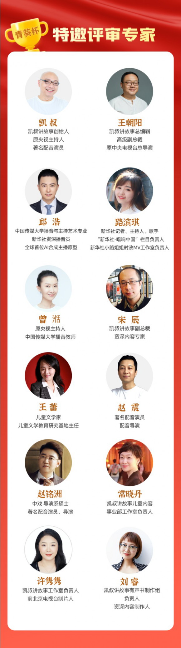 活動(dòng)從凱叔講故事App中精選9個(gè)優(yōu)質(zhì)中國故事作為范本,包括紅色故事、國學(xué)、名著三個(gè)方向,參與活動(dòng)的小朋友可從中任意選擇一個(gè),自行演繹,拍成視頻,以投稿的方式,上傳至新華社客戶端青春版上報(bào)名。本次大賽特別邀請(qǐng)到:凱叔講故事App創(chuàng)始人、原央視主持人凱叔,凱叔講故事App總編輯高級(jí)副總裁王朝陽等12位評(píng)審專家,通過投票和評(píng)審兩個(gè)環(huán)節(jié),最終評(píng)選出綜合表達(dá)力、創(chuàng)造力、完整度三方面表現(xiàn)優(yōu)異的小朋友,入選星星榜(300名)、青葵榜(100名),屆時(shí)會(huì)發(fā)放新華社客戶端青春版和“凱叔講故事”認(rèn)證的大賽證書和禮包,以資鼓勵(lì)。