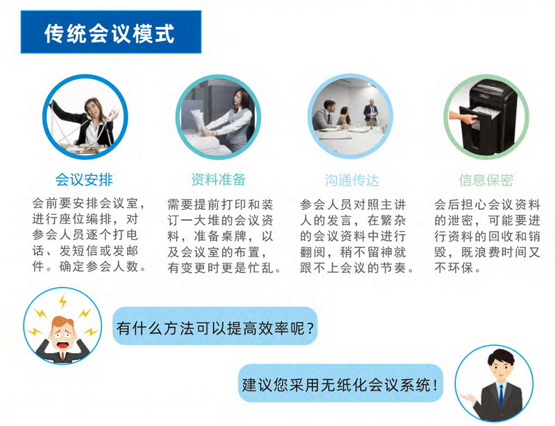 在政府機(jī)關(guān)、科研機(jī)構(gòu),和各企事業(yè)單位,每年各種會(huì)議較多,會(huì)議材料用紙量較大,印制等各種費(fèi)用較高,人力及時(shí)間消耗較多,不僅增加成本,而且也不適應(yīng)信息化時(shí)代的發(fā)展。同時(shí)與建設(shè)一個(gè)高效,節(jié)能,環(huán)保的社會(huì)也不相稱。無(wú)紙化不僅能大大提高工作效率,對(duì)環(huán)保節(jié)能也具有深遠(yuǎn)的意義。
