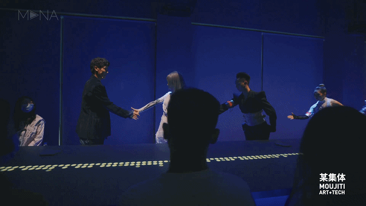 《現(xiàn)在史·數(shù)字人類[-∞,∞]》從虛擬和現(xiàn)實(shí)出發(fā),作品分為了共生、束縛和輪回三個(gè)過(guò)程,F(xiàn)場(chǎng)是由多名物理舞者與虛擬數(shù)字人類進(jìn)行物理與數(shù)字的隔空界面對(duì)話。創(chuàng)作內(nèi)容聚焦于時(shí)間與人類記憶的話題,從虛擬的數(shù)字人類產(chǎn)生故事角色, 將人類所處的狀態(tài)概念為一個(gè)莫比烏斯環(huán),當(dāng)想要前行時(shí),卻在當(dāng)下繞圈子,當(dāng)想要進(jìn)入時(shí),卻發(fā)現(xiàn)身處圈外,然而我們其實(shí)一直未離開(kāi)過(guò)這個(gè)圈。