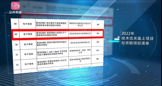 2021年11月24日,深圳市科技創(chuàng)新委員會發(fā)表關(guān)于2022年技術(shù)攻關(guān)面上項(xiàng)目擬資助公示名單。在電子信息領(lǐng)域,深圳藍(lán)普視訊科技有限公司以“重2022064超高清Micro LED大尺寸智能屏的關(guān)鍵技術(shù)研發(fā)”項(xiàng)目入選該名單。藍(lán)普視訊創(chuàng)立于2012年,是一家專注于新型顯示面板、大數(shù)據(jù)信息可視化、光學(xué)電子、圖像處理、信號傳輸?shù)燃夹g(shù)領(lǐng)域的大屏幕數(shù)字顯示系統(tǒng)和大數(shù)據(jù)信息可視化綜合解決方案提供商。