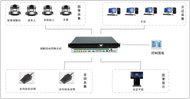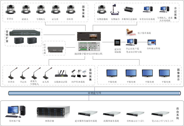 數(shù)字審理綜合控制主機、調解綜合控制主機、應用電腦、圖像采集、證據(jù)采集、顯示輸出、旁聽及信息展示、音頻采集、音響擴音、可視化集中控制終端、同聲傳譯、存儲擴容。