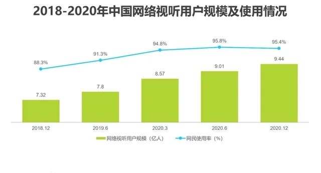 截至2020年底,中國網(wǎng)絡視聽用戶占整體網(wǎng)民規(guī)模的比例已高達95.4%。