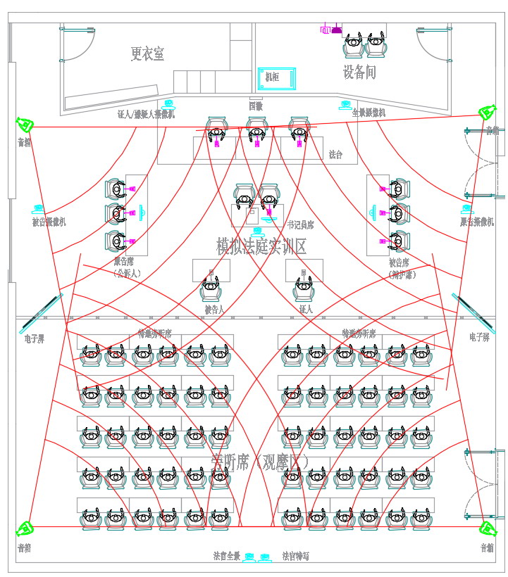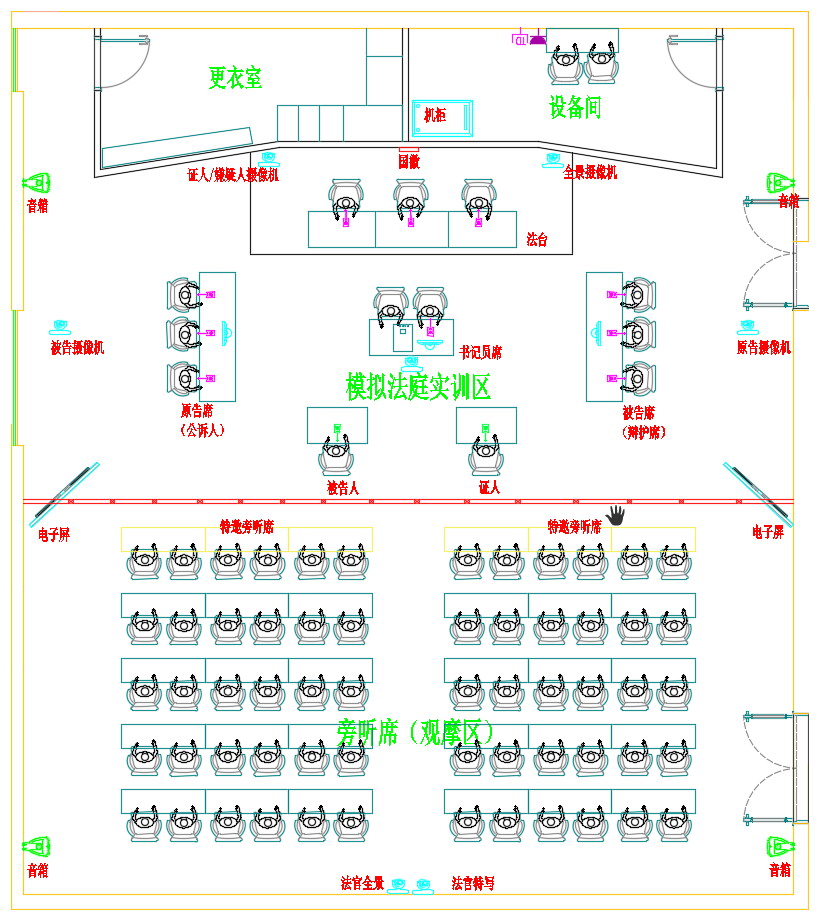 更衣室:主要可滿足在開展模擬審判教學(xué)及競賽時(shí),供老師、學(xué)生、裁判等更衣及儲(chǔ)物使用,兼具合議室功能。