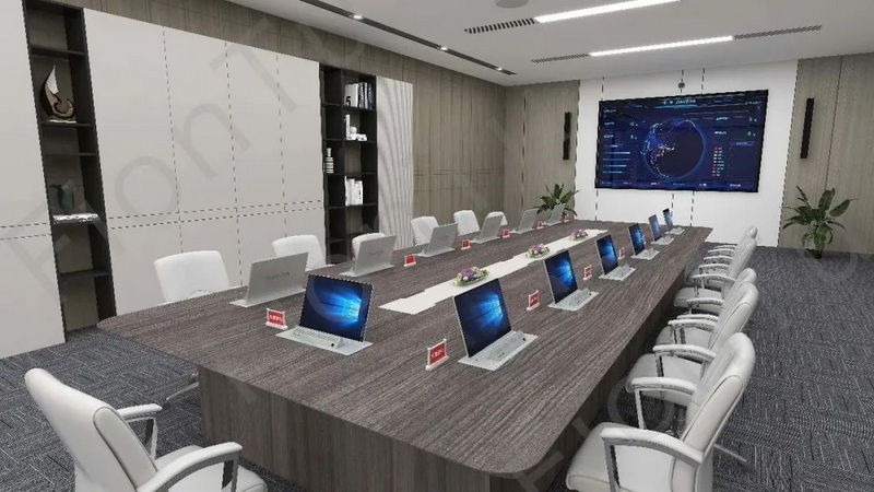 二樓信息研討室 可對(duì)指揮大廳接收的突發(fā)事件及緊急情況進(jìn)行討論分析、決策。系統(tǒng)包含:FionTu方圖自主創(chuàng)研無(wú)紙化會(huì)議系統(tǒng),該產(chǎn)品集無(wú)紙化升降屏、發(fā)言話筒為一體,具有良好的使用操作性;以及音頻擴(kuò)聲系統(tǒng)、電子紙會(huì)議桌牌、多媒體顯示系統(tǒng)等;音視頻系統(tǒng)融合一體,系統(tǒng)易操作、穩(wěn)定且安全,既可滿(mǎn)足日常監(jiān)控需求,又可滿(mǎn)足突發(fā)狀況應(yīng)急指揮需求。