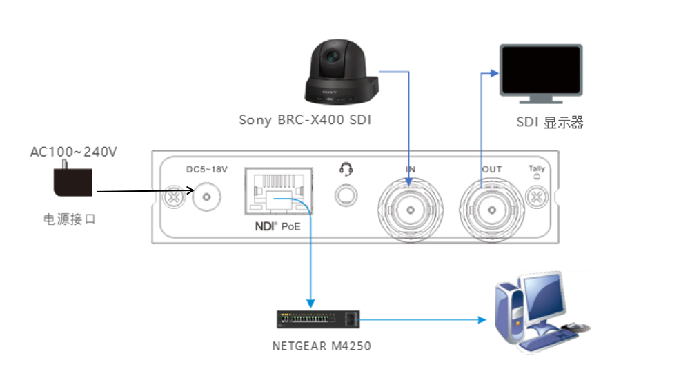 由索尼相機(jī)給N30提供視頻源,并將N30設(shè)備連接到 NETGEAR M4250 。