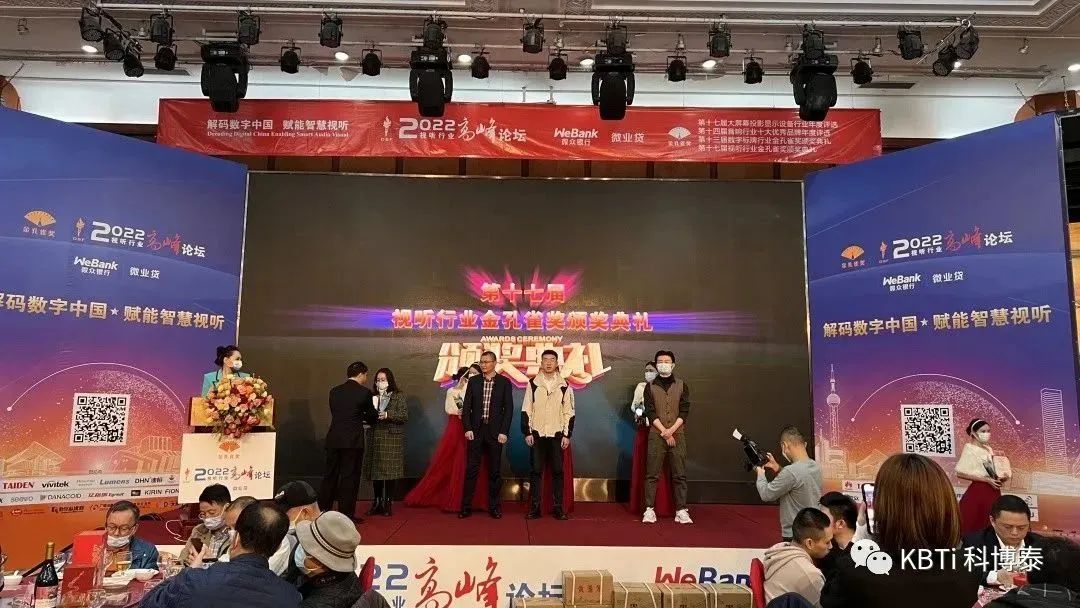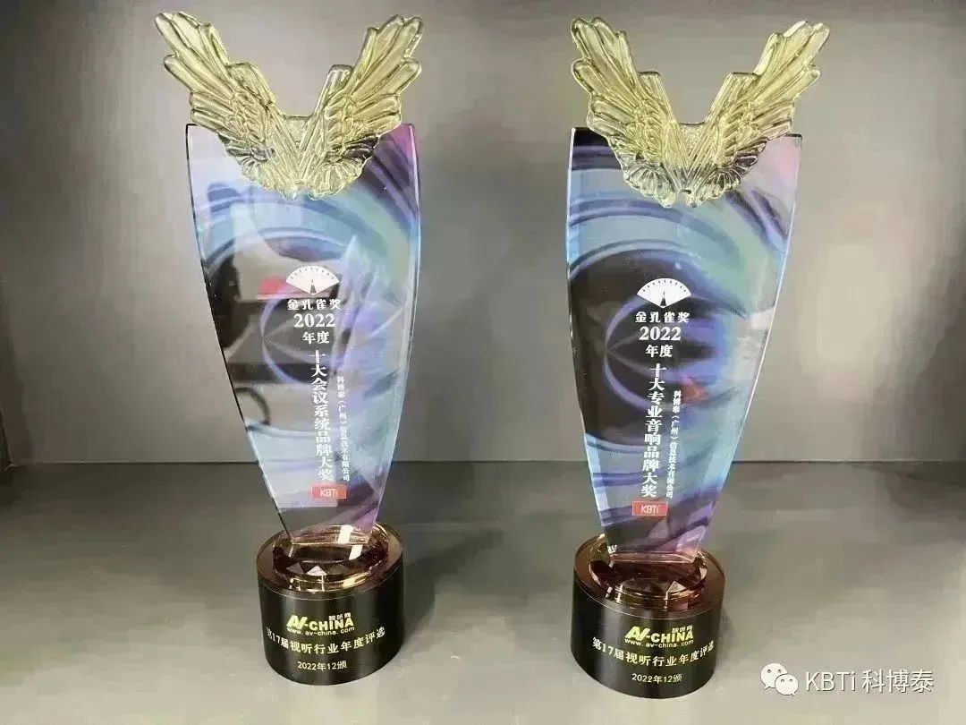 我司非常榮幸的能夠參與此次的頒獎典禮大會,在本屆頒獎典禮上,科博泰受到主辦方和業(yè)內(nèi)同行的認(rèn)可,榮獲兩個2022年度金孔雀獎杯和相關(guān)的榮譽(yù)證書,分別是“2022年度十大專業(yè)音響品牌大獎“和”2022年度十大會議系統(tǒng)品牌大獎“