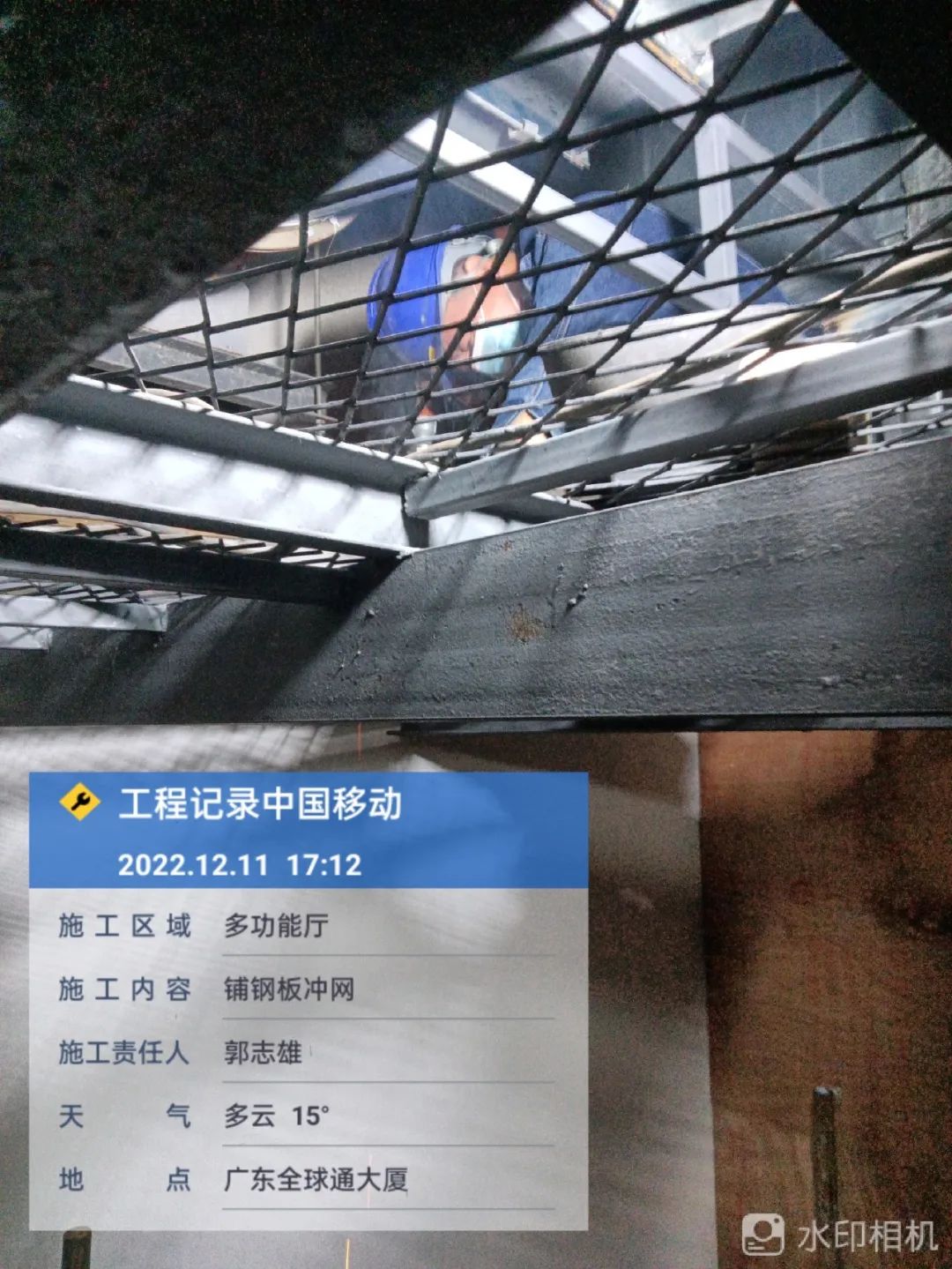 馬道主梁及輔梁安裝完成,進鋼板沖網(wǎng)的安裝與固定