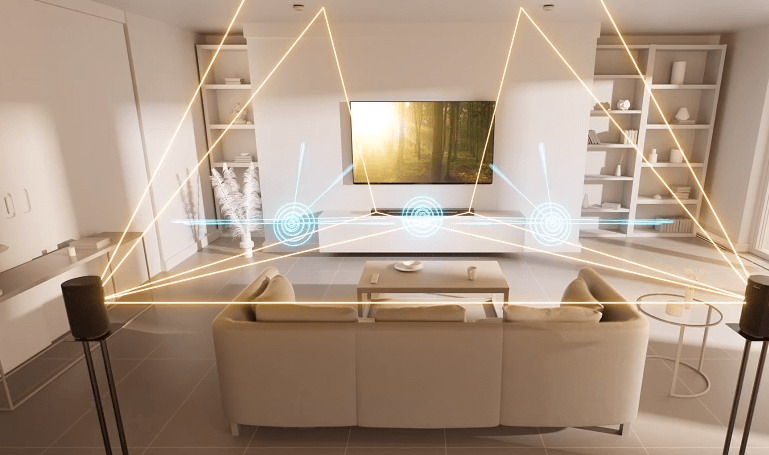 360SSM技術(shù)首先通過內(nèi)置麥克風(fēng)測量回音壁和后環(huán)繞音箱的相對高度和位置,并根據(jù)房間布局自動優(yōu)化聲音;再基于位置信息合成聲波來創(chuàng)建多個真實發(fā)聲的幻像揚聲器,發(fā)出球狀聲波,構(gòu)建出比實體揚聲器范圍更寬廣的聲場,打造全方位環(huán)繞、極具沉浸感的聆聽效果。用戶使用產(chǎn)品時,不用再受傳統(tǒng)家影精確擺放位置和繁瑣布線的困擾,通過輕松靈活地擺放,就能打造出對自己家庭環(huán)境來說理想的穹頂式全方位廣域環(huán)繞聲場。