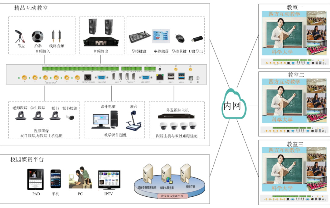 全自動(dòng)錄播系統(tǒng)主要完成教師、學(xué)生的視頻自動(dòng)跟蹤采集,音頻智能采集,教師電腦屏幕截取,教師/學(xué)生視頻/計(jì)算機(jī)畫面智能導(dǎo)播,以上信號(hào)源自動(dòng)傳送至課件實(shí)時(shí)錄制系統(tǒng)生成優(yōu)質(zhì)的精品課程,同時(shí)通過課堂直播系統(tǒng)在局域網(wǎng)、互聯(lián)網(wǎng)上直播為遠(yuǎn)端用戶提供在線實(shí)時(shí)學(xué)習(xí)的平臺(tái)。