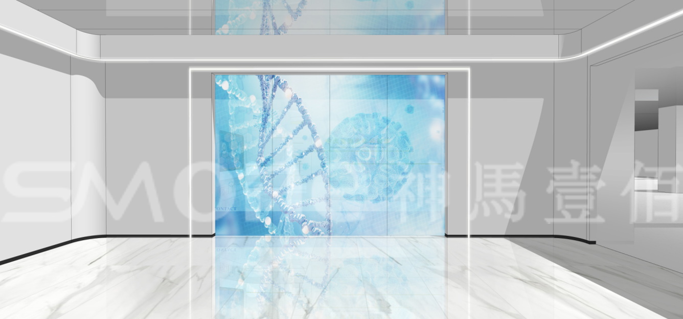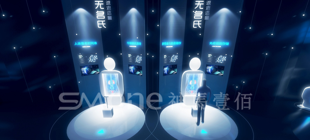 SMONE本次策展以時(shí)間為刻度,以細(xì)胞為本源探索生命的長度、深度、高度。入口設(shè)置全息投影門,參觀者來到感應(yīng)識(shí)別區(qū)域,全息門觸發(fā)光影特效并緩緩打開,開啟展廳的參觀,在空間上起到了分隔作用,增強(qiáng)參觀儀式感。