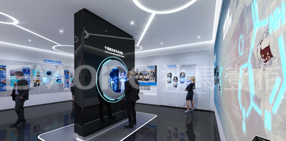干細(xì)胞機(jī)械互動(dòng)裝置實(shí)時(shí)感應(yīng)監(jiān)測透明屏人體無名氏外表發(fā)生變化,相連的打干細(xì)胞裝置從透明屏人體腳底將填充干細(xì)胞,由感應(yīng)裝置接收信息,根據(jù)打氣的多少展示干細(xì)胞的多少和面容的改變。