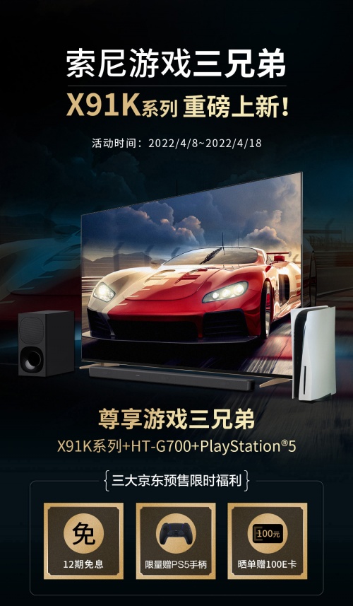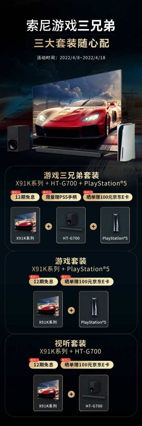 目前,索尼游戲三兄弟套裝已在京東開啟預(yù)售,4月18日結(jié)束預(yù)售!為滿足不同的用戶需求,索尼有三大套裝供選:游戲套裝(含X91K + PS5)、視聽套裝(含X91K + HT-G700)、全享套裝(X91K + HT-G700 + PS5)。上京東,選擇適合自己的套裝,即可享受價(jià)格優(yōu)惠,同時(shí)更有12期免息、曬單還有機(jī)會獲得京東E卡等眾多福利。與此同時(shí),在索尼中國與京東家電官方微博,你還能參與轉(zhuǎn)發(fā)抽獎(jiǎng),并有機(jī)會獲得索尼游戲三兄弟套裝豪華大禮包!一切準(zhǔn)備就緒,只待熱愛游戲、享受生活、追求品質(zhì)視聽的你,千萬不要錯(cuò)過!