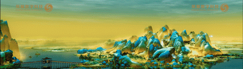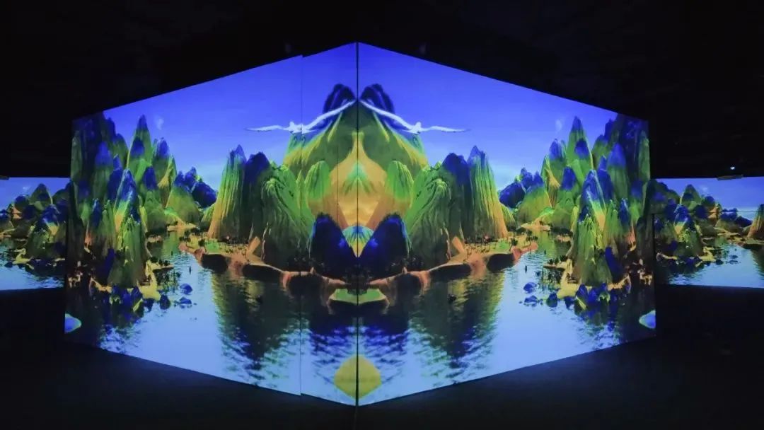 通過傳統(tǒng)藝術(shù)的數(shù)字活化將江山圖各部分動態(tài)化數(shù)字化,分別以古人與今人的視角對作品重新審視與建構(gòu)。以大觀小、曠觀、神游、浸入式的視覺體驗、散點透視與焦點透視的自由切換,讓觀眾在現(xiàn)代與傳統(tǒng)、科技與藝術(shù)之間來回穿梭,在形式上通過光學(xué)鏡面反射的原理,將空間向外延展,從而形成一個無限延伸的廣闊空間,讓觀眾仿佛置身于千里江山之中,感受壯麗山河中所傳達出自信與氣勢。