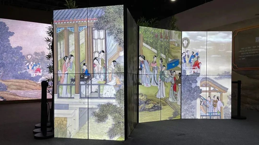 大展采用MR混合現(xiàn)實技術(shù)、全息多媒體技術(shù)、AI智能人臉識別等數(shù)字科技手段,對中國經(jīng)典畫作:《千里江山圖》、《西山雨觀圖》、《浴馬圖》、《韓熙載夜宴圖》、《月曼清游圖》、《貨郎圖》等進行創(chuàng)意詮釋,按畫作內(nèi)容分類的邏輯打造了六大主題數(shù)字體驗區(qū),將名家畫作意境轉(zhuǎn)變?yōu)槊垒喢缞J的感映空間,打破文化、藝術(shù)、科技界限,讓觀眾沉浸在中國傳世名畫的意境之中,與古人進行一場超越時空的文化對話體驗。